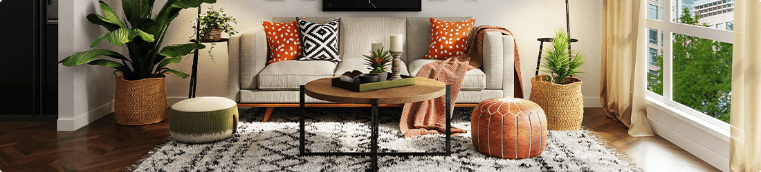 Play around with different shapes and styles for an eclectic effect. Rectangular and oval coffee tables are the right choice for bigger rooms and setups. Add one big rectangular table in front of your impressive sofa, or work with a set of 2 or 3 tables for more visual impact.