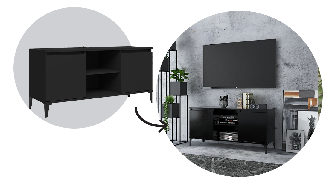 To create a real industrial feel, use furniture that combines the two most popular industrial materials, wood and metal. Look for pieces that can easily become the centrepiece of the room, such as a black wooden TV unit with metal legs and open shelving.