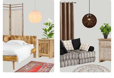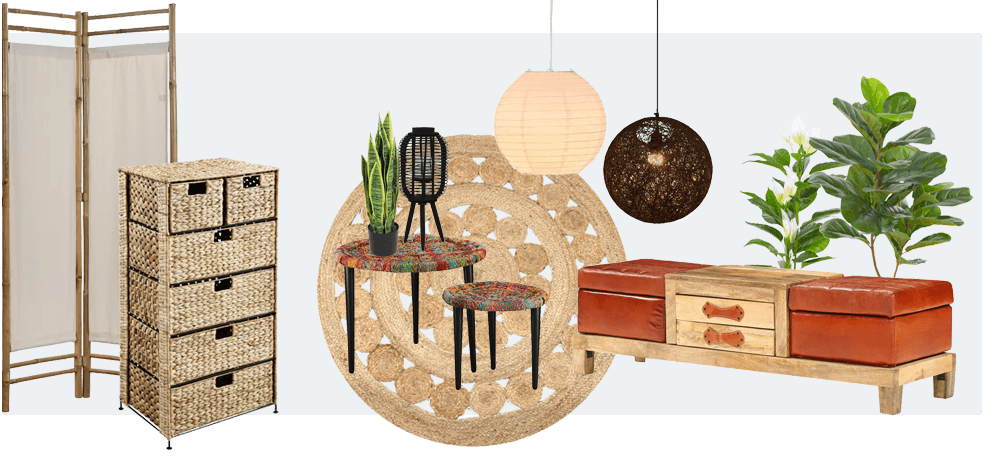 There are no two bohemian interiors that look exactly the same. This is the perfect style if you want to create something unique. Boho furniture is made of natural materials such as rattan, bamboo, wicker, jute, sisal and recycled wood. This style allows you to experience the places you’ve travelled all over again by displaying these accessories in a nice cabinet or on a side table.