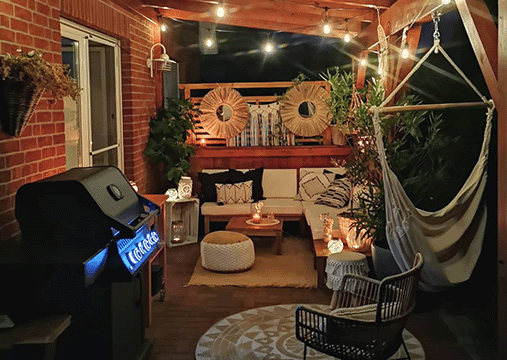 Design an Al Fresco living décor that has a homey feel. Fireplaces, blankets, lights, and rugs are perfect for the ultimate outdoor lounge vibe!